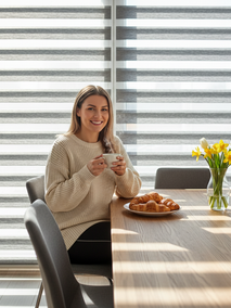 рулонные шторы Зебра – это находка. Их конструкция с чередующимися полосами из плотной и прозрачной ткани позволяет очень тонко регулировать поток света. Хотите много света для утреннего кофе, но потом убавить его для обеда, сохранив вид из окна? С этим справится Зебра. Это идеальный компромисс между открытым окном и полной приватностью, а также отличный способ избежать раздражающих бликов на посуде или мониторе.