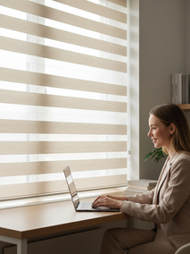 \nКогда нужно не просто убрать блики, но и иметь возможность регулировать интенсивность естественного света, сохраняя при этом приватность, на помощь приходят рулонные шторы «Зебра». Их чередующиеся прозрачные и плотные полосы позволяют очень точно дозировать свет, создавая идеальный баланс. Это как оптический зум для вашего окна: можно быстро перейти от яркого освещения к мягкому полумраку, просто сместив полотна. Этот тип штор идеально подходит для тех, кто хочет гибко управлять обстановкой в течение дня, подстраиваясь под разные задачи и уровень солнечной активности.