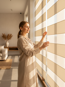 Это, пожалуй, одно из самых элегантных и функциональных решений для вашей задачи. Полотна рулонных штор «Зебра» состоят из чередующихся полос плотной и прозрачной ткани. Смещая их относительно друг друга, вы можете добиться полного уединения, частично приглушить свет или максимально открыть доступ солнечному свету.