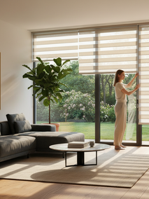 - Рулонные шторы «Зебра» (День-Ночь). Если задача состоит в том, чтобы точно дозировать свет и при этом сохранять вид, то рулонные шторы «Зебра» – идеальный вариант. Их уникальная двухслойная конструкция из чередующихся прозрачных и плотных полос позволяет легко регулировать освещенность. Вы можете совместить прозрачные полосы, чтобы любоваться видом, или сдвинуть плотные – для максимальной защиты от солнца и посторонних взглядов. Это очень функциональное и элегантное решение. Узнайте больше про Зебра (день-ночь).