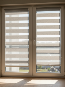 - Рулонные шторы «Зебра» (День-Ночь). Это гибрид рулонной шторы и жалюзи. Конструкция из двух слоев ткани с чередующимися прозрачными и плотными полосами позволяет плавно менять уровень освещенности. Ознакомиться с вариантами можно в разделе рулонные шторы зебра.