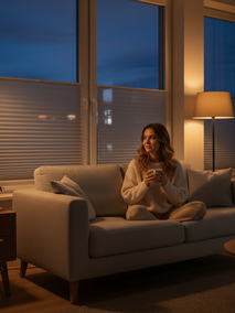 - Совет мастера: Для вечерней приватности, когда свет в комнате горит, а на улице уже темно, переведите шторы в режим \"ночь\" – плотные полосы перекроют прозрачные, и вы будете надежно защищены от взглядов.
