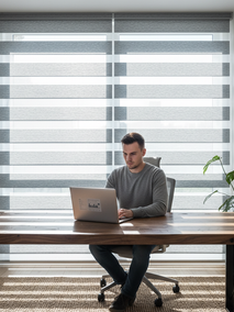 - Точный контроль: Горизонтальные жалюзи позволяют очень точно регулировать угол наклона ламелей, направляя солнечные лучи так, чтобы они не попадали на экран ноутбука и не нагревали помещение.