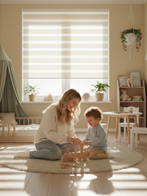 Совет от мастера: Для максимального удобства и безопасности (из-за отсутствия шнуров) для рулонных штор доступен удобный электропривод, позволяющий управлять ими с пульта или даже со смартфона. Это особенно удобно, когда нужно быстро создать полумрак для дневного сна малыша, не заходя в комнату.