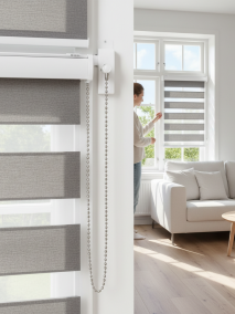 - Шторы «Зебра» (День-Ночь). Состоят из двойного полотна с чередующимися прозрачными и плотными полосами. Смещая полосы относительно друг друга, можно очень плавно регулировать уровень освещённости — от лёгкого рассеивания до полного затемнения.