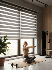 Эти шторы – настоящее спасение для тех, кто хочет гибко регулировать свет в течение дня. Рулонные шторы «Зебра», или День-Ночь, состоят из чередующихся полос плотной и прозрачной ткани. Смещая их относительно друг друга, вы можете добиться идеального освещения: от яркого солнечного света до мягкого полумрака или полной приватности. Это решение позволяет вам настроить интенсивность света, не поднимая штору полностью, что особенно удобно при чередовании различных упражнений, требующих разной освещенности.