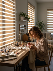 - Для работы: Вы можете выбрать ткани с разной плотностью. Светопропускающие материалы рассеивают солнечный свет, создавая равномерное, мягкое освещение, которое снижает нагрузку на глаза при длительной работе с мелкими деталями. Вы забудете о тенях и бликах, мешающих сосредоточиться.