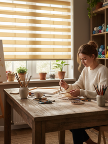 Рулонные шторы — это, пожалуй, одно из самых универсальных решений для творческого уголка. Они позволяют легко и плавно регулировать степень освещенности, создавая мягкий, рассеянный свет, столь ценный для художников и рукодельниц. Вы можете выбрать ткани разной плотности: от легких, пропускающих свет и сохраняющих обзор, до полностью затемняющих (блэкаут), идеальных для работы с проектором или при необходимости полного отсутствия бликов.
