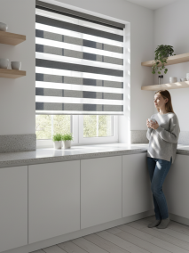 Если вы хотите добавить в интерьер больше уюта, обратите внимание на рулонные шторы. Современные ткани для них обрабатываются специальными составами, которые отталкивают пыль, влагу и жир. Благодаря этому они долго сохраняют первоначальный вид. Особой популярностью пользуются рулонные шторы зебра или, как их ещё называют, «День-ночь». Их конструкция из чередующихся прозрачных и плотных полос позволяет легко управлять освещением. Как и деревянные жалюзи, рулонные шторы можно автоматизировать.