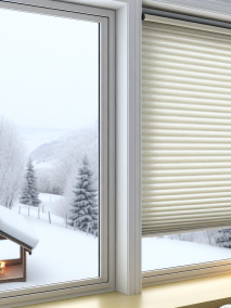 Плиссе (особенно «соты») — один из самых «тёплых» вариантов. Ячеистая структура удерживает воздушную прослойку, а монтаж в штапик минимизирует щели по периметру. Плюс удобно регулировать свет сверху и снизу — актуально при низком зимнем солнце.