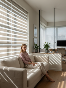 - Рулонные шторы Зебра (день-ночь). Это, пожалуй, самое универсальное решение для зоны отдыха. Чередующиеся полосы плотной и прозрачной ткани дают беспрецедентный контроль над светом. Вы можете настроить их так, чтобы получить мягкий рассеянный свет для чтения, или полностью закрыть для просмотра фильма. Это идеальный вариант для создания разных сценариев освещения в течение дня. Рулонные шторы Зебра – это о гибкости и адаптивности.