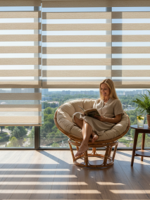 - Рулонные шторы Зебра (День-Ночь). Если вам нужно регулировать поток света в течение дня, не погружая балкон в полную темноту, "Зебра" – отличный выбор. Чередующиеся полосы плотной и прозрачной ткани позволяют точно настроить освещение, создавая комфортную полутень.