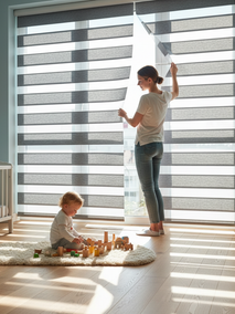 Рулонные шторы Зебра, или «День-Ночь», — это настоящее спасение для детских. Их уникальная конструкция из чередующихся полос плотной и прозрачной ткани позволяет одним движением регулировать световой поток от яркого дневного света до глубокой полутени, или даже почти полного затемнения. Просто смещайте полосы относительно друг друга, и комната мгновенно преобразится.