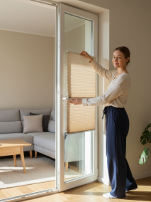 жалюзи Плиссе. Это по-настоящему элегантное решение для балконной двери. Плиссе монтируются прямо на штапик, создавая минимальный зазор. Они обладают уникальной возможностью открываться как сверху вниз, так и снизу вверх. Это значит, что вы можете закрыть только нижнюю часть окна для защиты от посторонних взглядов, оставив верхнюю открытой для естественного света.