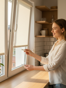 рулонные шторы, особенно системы MINI и кассетные (UNI). Их ключевое преимущество — это крепление непосредственно на оконную створку. Это значит, что при открытии окна штора движется вместе с ним, не мешая проветриванию и не занимая место в оконном проеме.