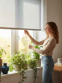 Классические горизонтальные жалюзи, особенно модели с креплением на раму (включая систему Isotra), прекрасно справляются с задачей сохранения свободного подоконника. Ламели плотно прилегают к стеклу, не мешая открыванию окна и не конфликтуя с предметами на подоконнике. Это надежное и проверенное решение для точной регулировки света. Если вы выбираете деревянные горизонтальные жалюзи, для них также доступна опция электропривода, что делает их использование еще более комфортным и современным.