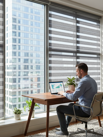 Когда хочется одновременно регулировать уровень освещения и наслаждаться видом из окна, жалюзи Зебра (также известные как День-Ночь) станут вашим лучшим помощником. Их уникальная конструкция из чередующихся полос прозрачной и плотной ткани позволяет очень тонко настроить поток света, сдвигая полосы относительно друг друга. Вы сможете с легкостью убрать блики, сохранив при этом естественное освещение комнаты.