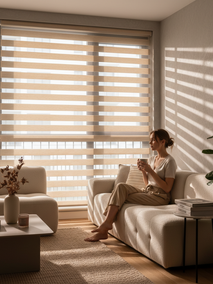 Если же вам хочется сочетать приватность и естественное освещение, обратите внимание на рулонные шторы Зебра (день-ночь). Их уникальная конструкция с чередующимися прозрачными и плотными полосами позволяет легко переключаться между полным закрытием и пропуском света, регулируя уровень приватности и освещенности по вашему желанию. Надежные механизмы гарантируют плавное движение и долговечность изделия.