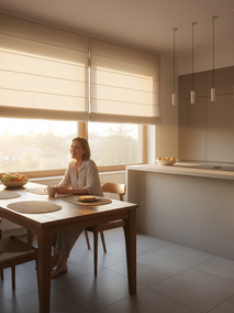 Если ваша главная задача – максимально перекрыть утреннее солнце, то рулонные шторы – отличное решение. Я всегда советую обращать внимание на плотность ткани. Для кухни, где солнце особенно агрессивно, выбирайте ткани блэкаут или димаут. Они обеспечивают высокую степень затемнения, блокируя до 90-100% света.