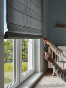 - Для проветривания шторы легко монтируются на створку или в проем, оставляя окно свободным. Вы можете открыть окно, а штора продолжит обеспечивать темноту. Надежные механизмы гарантируют плавный подъем и опускание. Некоторые рулонные шторы можно оснастить электроприводом для дистанционного управления — это очень удобно, когда малыш спит.