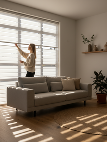 \n\nЕсли в вашей гостиной панорамные окна или вы предпочитаете более \"мягкое\" и элегантное решение, рассмотрите вертикальные жалюзи. Широкие ламели и разнообразие тканей позволяют создавать изысканные композиции, которые визуально расширяют пространство. Возможность поворота ламелей на 180 градусов дает прекрасный контроль над светом и приватностью, позволяя вам легко регулировать количество солнечного света и степень уединения.